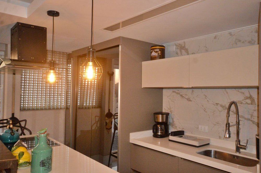 Cozinha planejada e equipada, integrada à área social