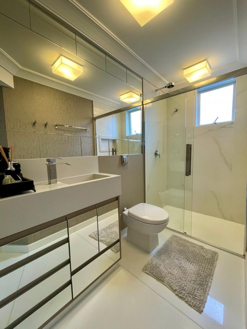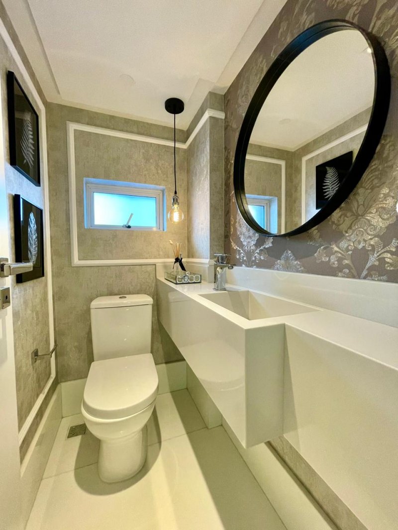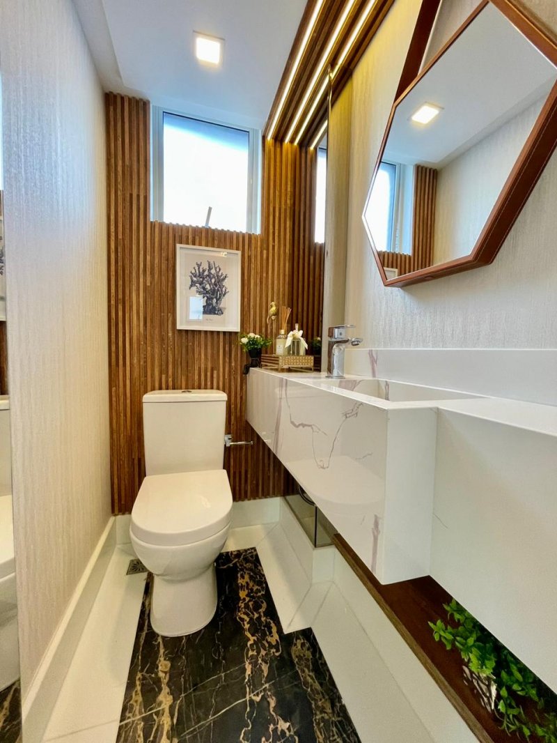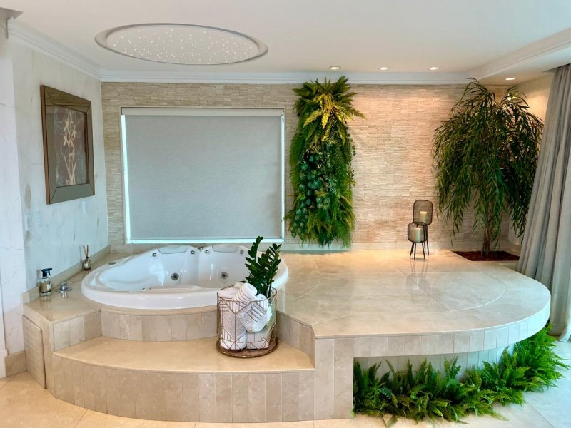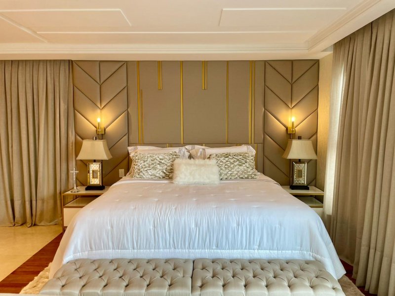 No segundo pavimento, duas suítes adicionais e um escritório com um aquário de 1000 litros se destacam, proporcionando uma experiência única de trabalho com vista para a sala. O terceiro pavimento abriga a suíte master de 90 m², com hidromassagem e sacada, além de uma área de festa completa com cozinha e churrasqueira. A piscina embutida no chão, com aquecimento solar e teto retrátil, é um convite ao relaxamento.