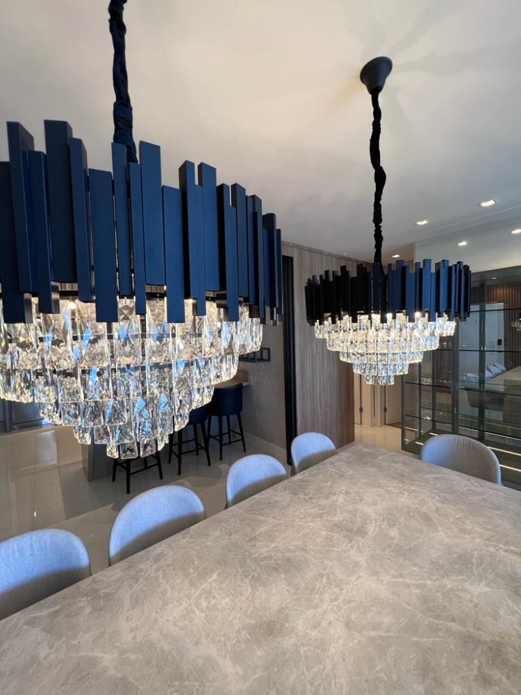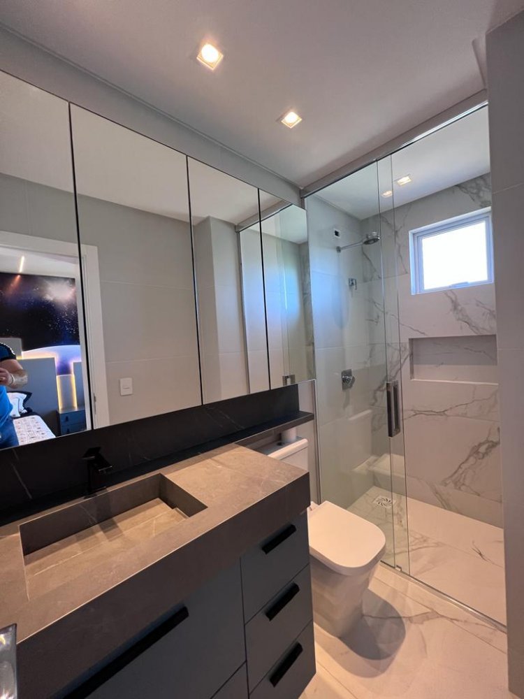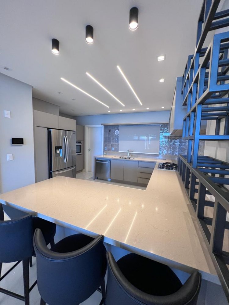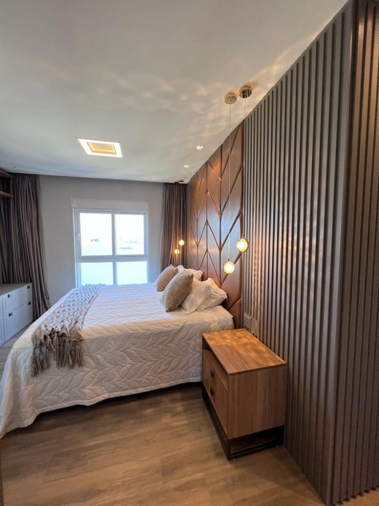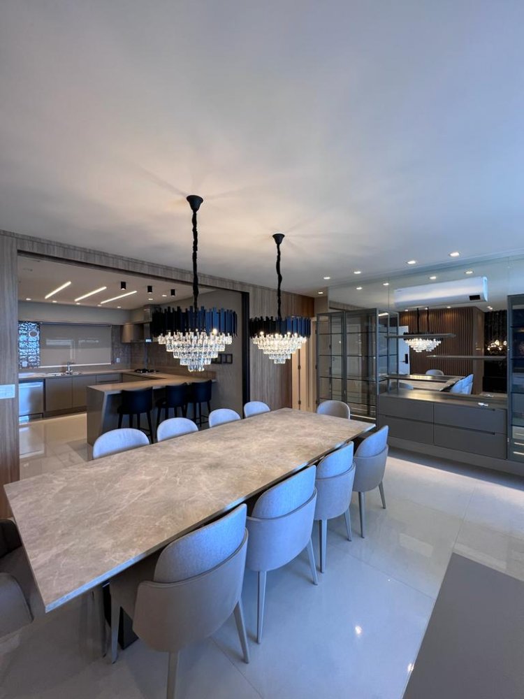Os móveis são de alto padrão, sob medida, garantindo o máximo aproveitamento dos espaços e proporcionando um ambiente requintado. Nas áreas de cozinha e banheiros, foram utilizadas pedras Decton e Silestone, materiais de alta qualidade e durabilidade, que conferem um toque moderno ao ambiente. Além disso, os eletrodomésticos são da marca Eletromec e os sofás da renomada marca Natuzzi. Para maior comodidade, as cortinas e a churrasqueira são automatizadas, facilitando o controle e ajuste conforme a preferência do morador.