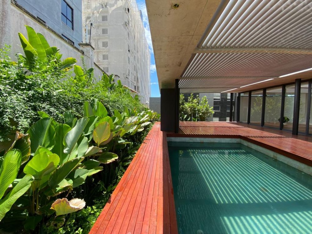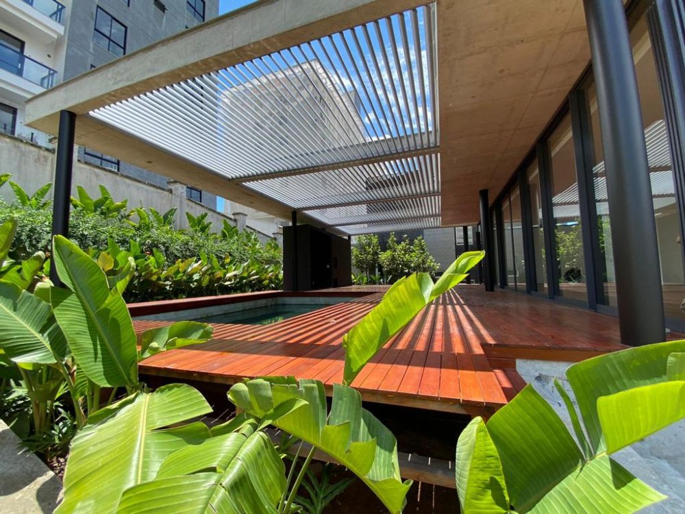 Na parte externa, o deck em cumaru é o local ideal para desfrutar de uma tarde ensolarada. A piscina, com revestimento em Pedra natural Hijau, agrega um toque tropical ao ambiente.