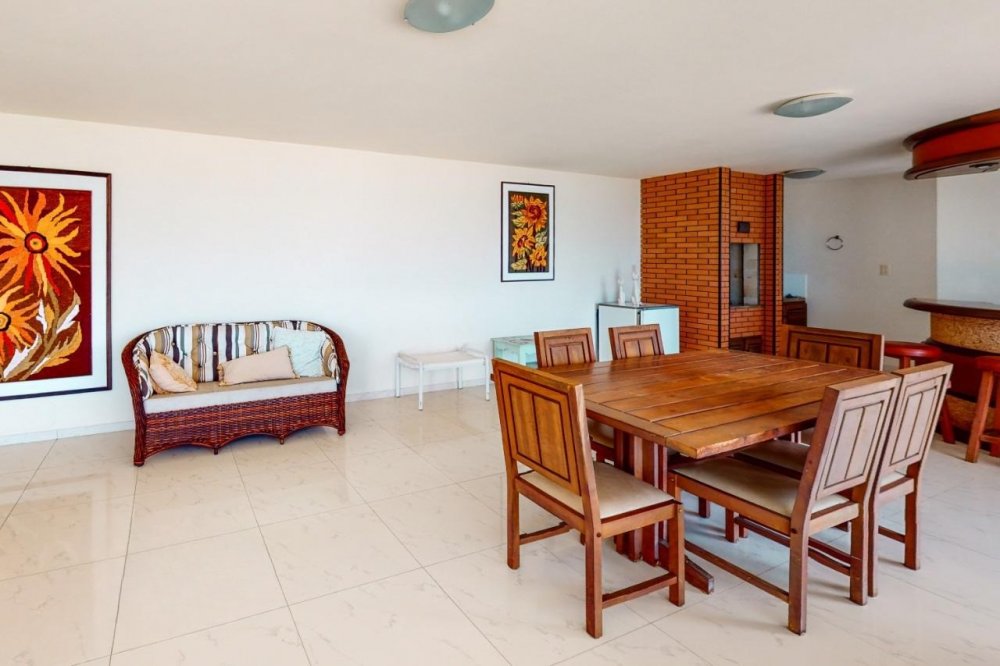 No pavimento superior, você encontra um espaço gourmet completo, com churrasqueira à carvão, lavabo social e um amplo terraço que proporciona uma vista de tirar o fôlego para o mar. Uma experiência única para momentos de lazer e relaxamento.