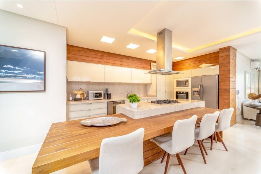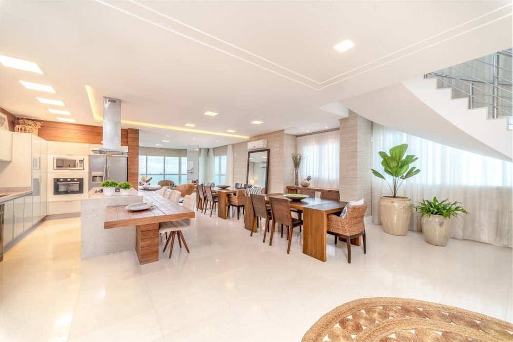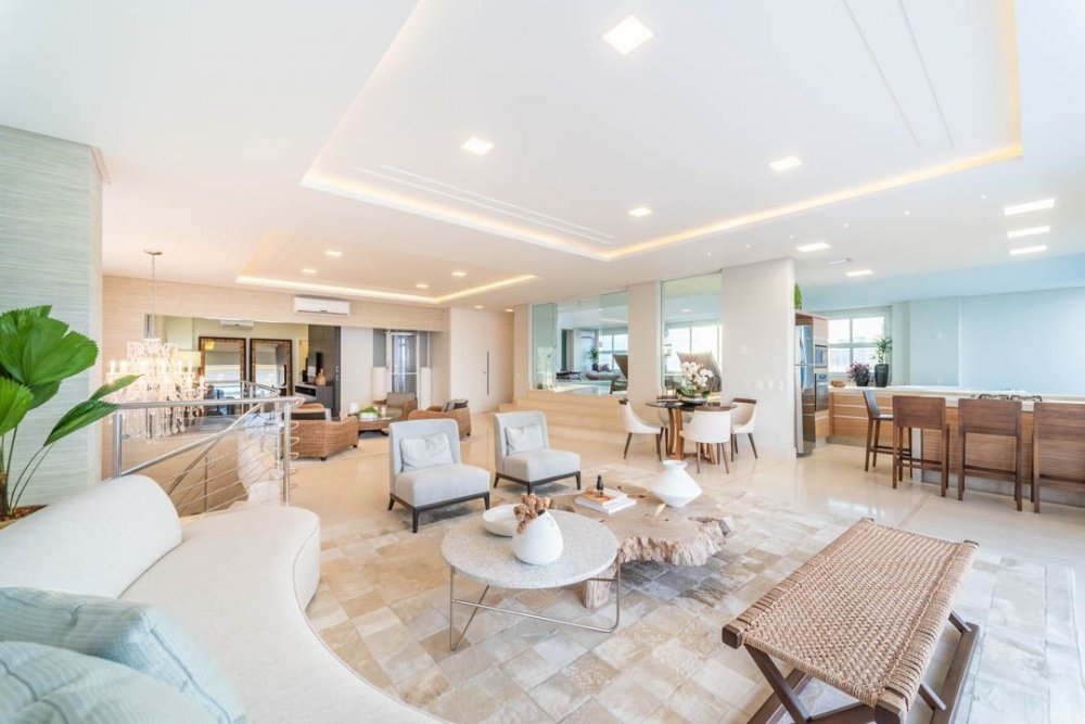 A entrada principal revela um amplo living integrado, cozinha americana com ilha central, e suítes luxuosas. A suíte máster impressiona com seu tamanho e vistas deslumbrantes.