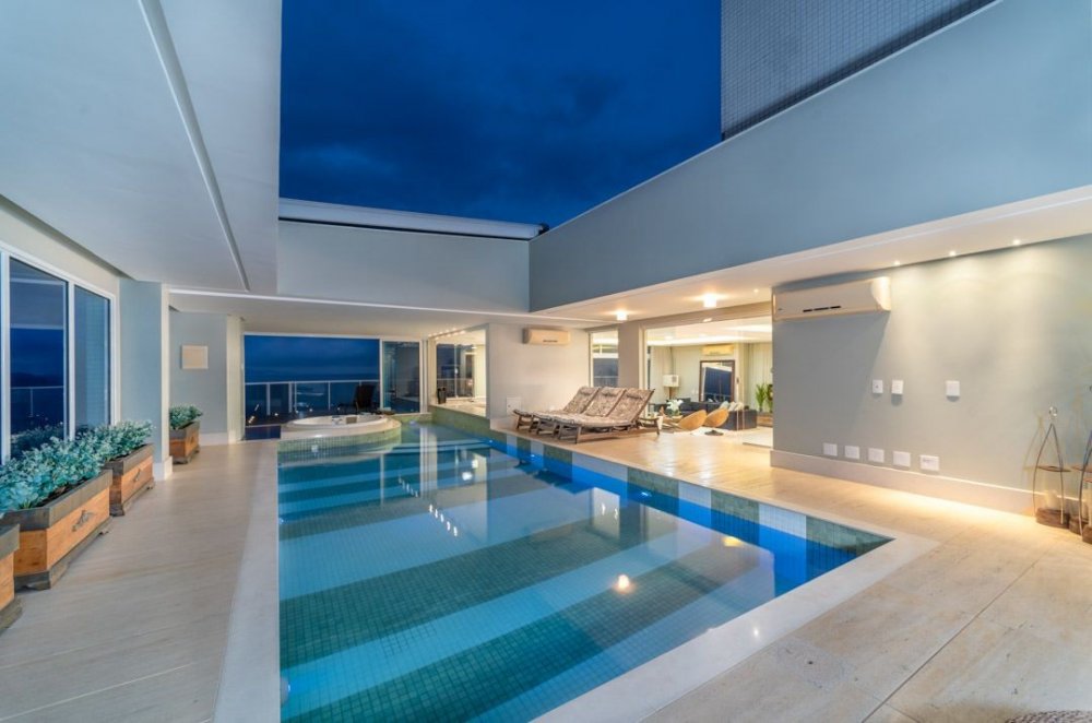 A piscina desta cobertura possui um teto retrátil inovador. Esse sistema permite controlar a exposição ao sol e, durante a noite, proporciona uma experiência única ao contemplar o céu estrelado enquanto desfruta de um banho noturno. A tecnologia do teto retrátil oferece versatilidade aos moradores, garantindo momentos agradáveis em diferentes condições climáticas.