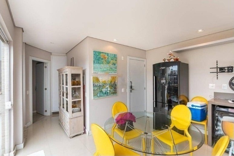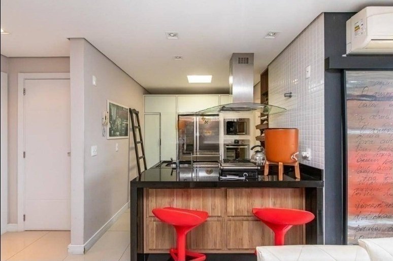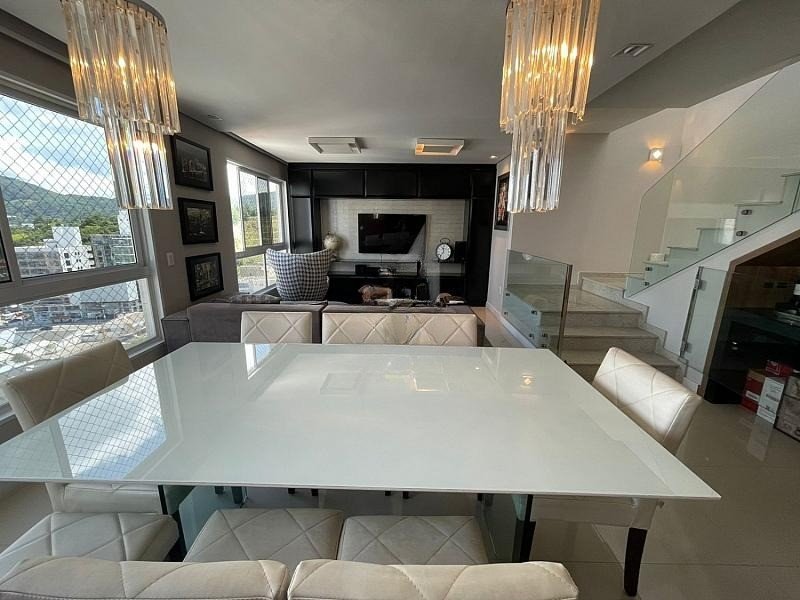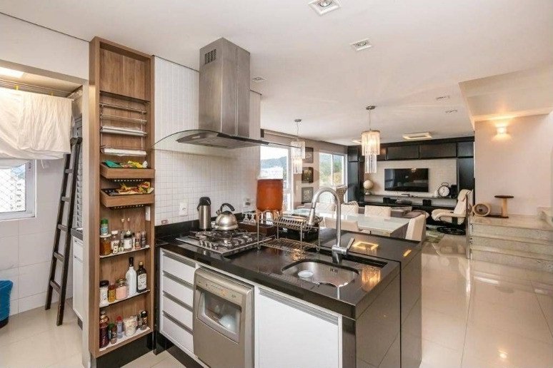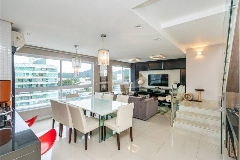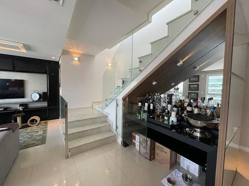 A cobertura possui 196 metros quadrados de área privativa e está completamente mobiliada, decorada e equipada. Com três suítes, sendo duas no primeiro andar e a suíte master no segundo andar com hidromassagem e closet, ela oferece um design contemporâneo e espaços de convivência integrados.
