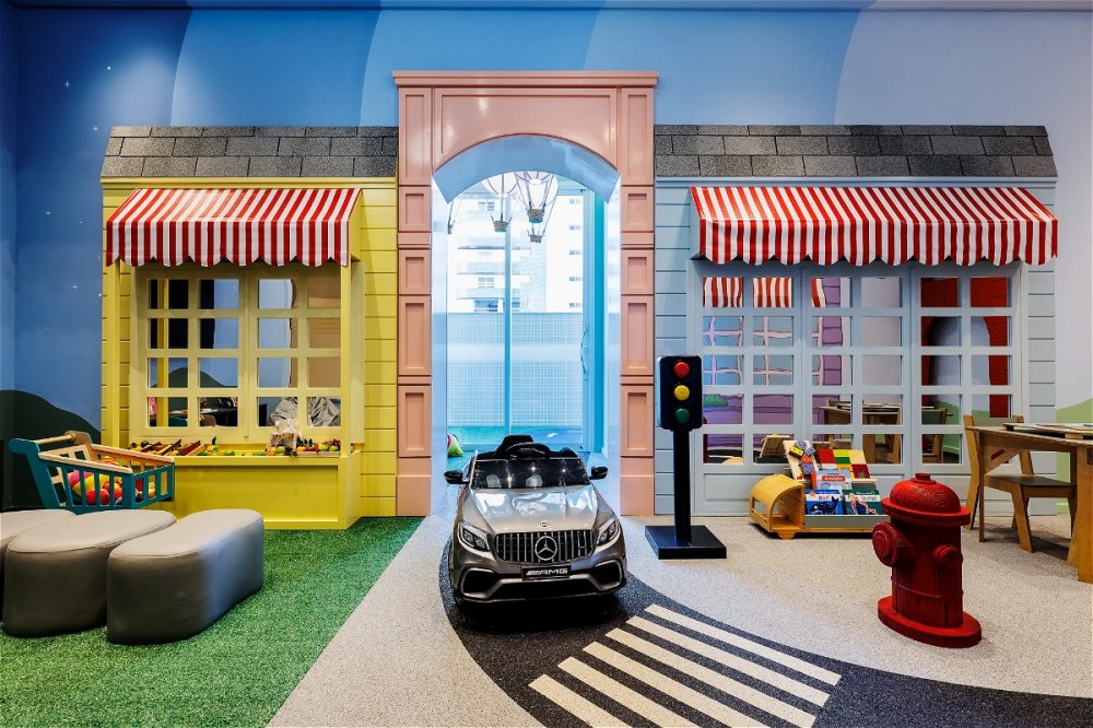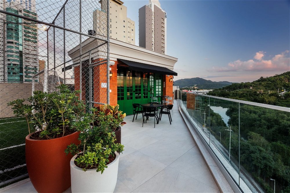 O edifício conta com piscinas, salão de festas, sala de jogos, quadra de futebol society e muito mais.