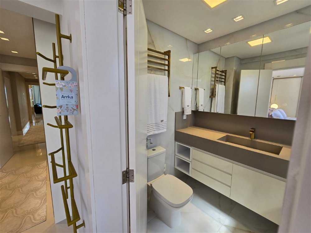 O apartamento conta com 3 suítes, oferecendo privacidade e conforto para os residentes, além de um lavabo para comodidade adicional.